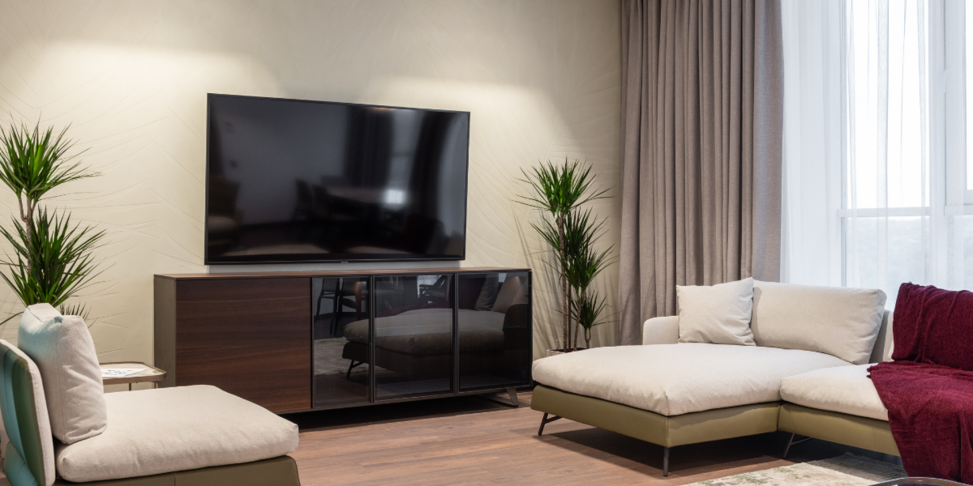 การจัดวางทีวีควรคำนึงถึงสัดส่วนที่เหมาะสมในห้อง ไม่ควรให้ทีวีใหญ่เกินไปจนทำให้ห้องดูอึดอัด หรือเล็กเกินไปจนทำให้ประสบการณ์การรับชมด้อยลง นอกจากการเลือกขนาดทีวีแล้ว ยังต้องคำนึงถึงพื้นที่รอบทีวีสำหรับอุปกรณ์เสริมต่าง ๆ เช่น ลำโพง ระบบเสียง หรือชั้นวางทีวี ควรจัดให้พื้นที่โดยรอบดูโล่งและสมดุล เพื่อให้การชมทีวีไม่ถูกรบกวนจากสิ่งรอบข้าง