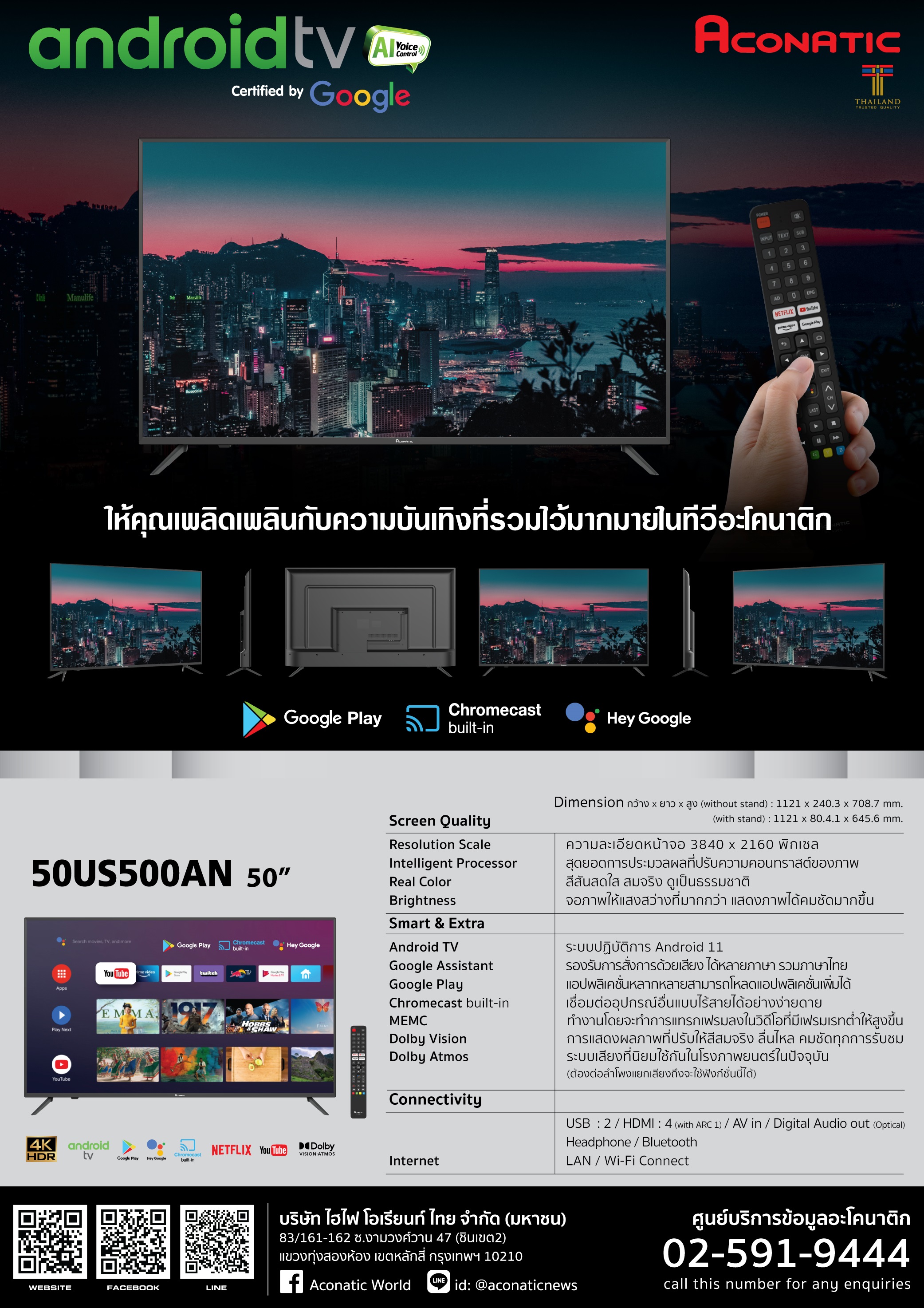 - สัมผัสประสบการณ์ความบันเทิงเต็มรูปแบบด้วย Aconatic 50US500AN สมาร์ททีวีระบบปฏิบัติการ Google 11 ที่รองรับการสั่งการด้วยเสียงได้หลายภาษา รวมถึงภาษาไทย พร้อมให้คุณดาวน์โหลดแอปพลิเคชันเพิ่มเติมได้ตามใจ และเชื่อมต่ออุปกรณ์อื่น ๆ แบบไร้สายได้อย่างง่ายดาย ทีวีรุ่นนี้มาพร้อมความละเอียด 4K ที่ให้ภาพคมชัดสมจริง พร้อมเทคโนโลยี MEMC ช่วยให้ภาพเคลื่อนไหวลื่นไหล พร้อมเพลิดเพลินกับภาพคมชัดสมจริงด้วย Dolby Vision และเสียงกระหึ่มรอบทิศทางแบบโรงภาพยนตร์ด้วย Dolby Atmos ในบ้านคุณเอง