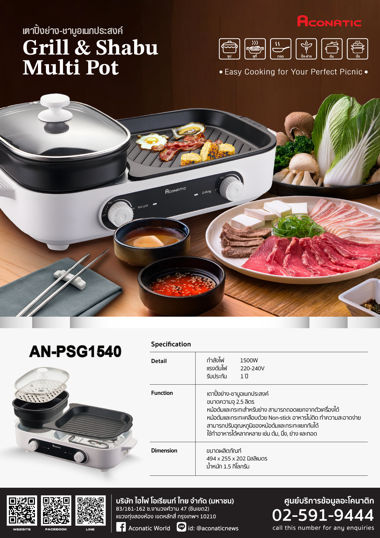 ACONATIC เตาปิ้งย่าง ชาบูเอนกประสงค์ รุ่น AN-PSG1540 ขนาด 2.5 ลิตร สามารถแยกชั้นได้ (รับประกัน 1 ปี)